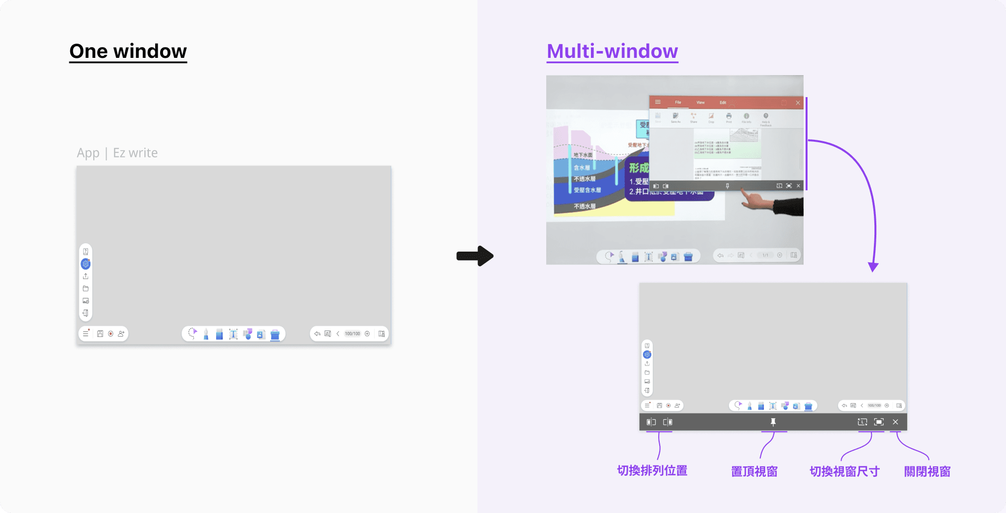 過去老師要切換畫面時僅能透過重新開啟與關閉軟體,容易造成用戶在切換的過程中迷路或切換失敗的情形。新版本能夠從側邊欄快速開啟多視窗功能,將軟體畫面視窗化後,老師能夠透過手指拖曳,輕鬆的將畫面移動到任意位置,也能從側邊欄切換最近使用的軟體。